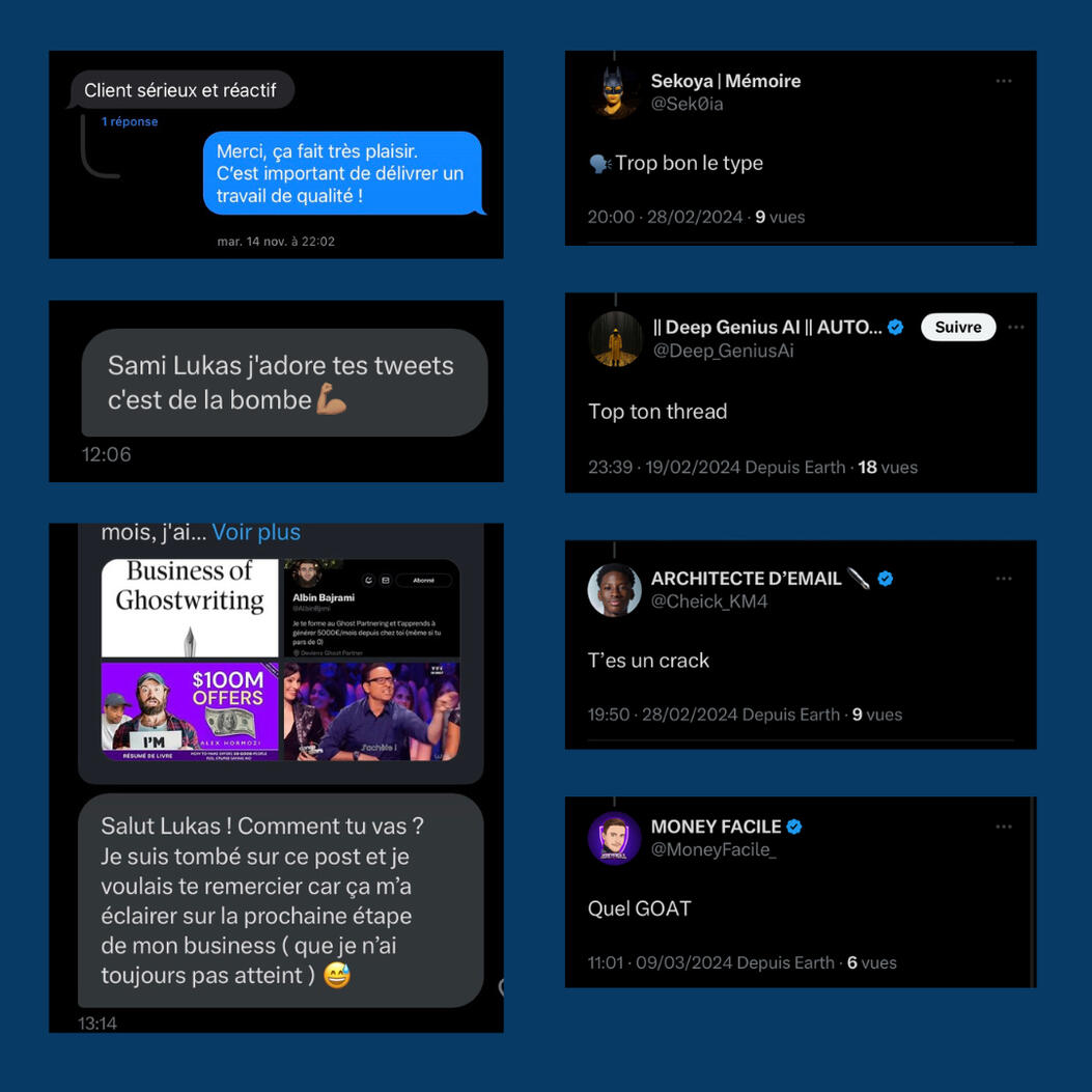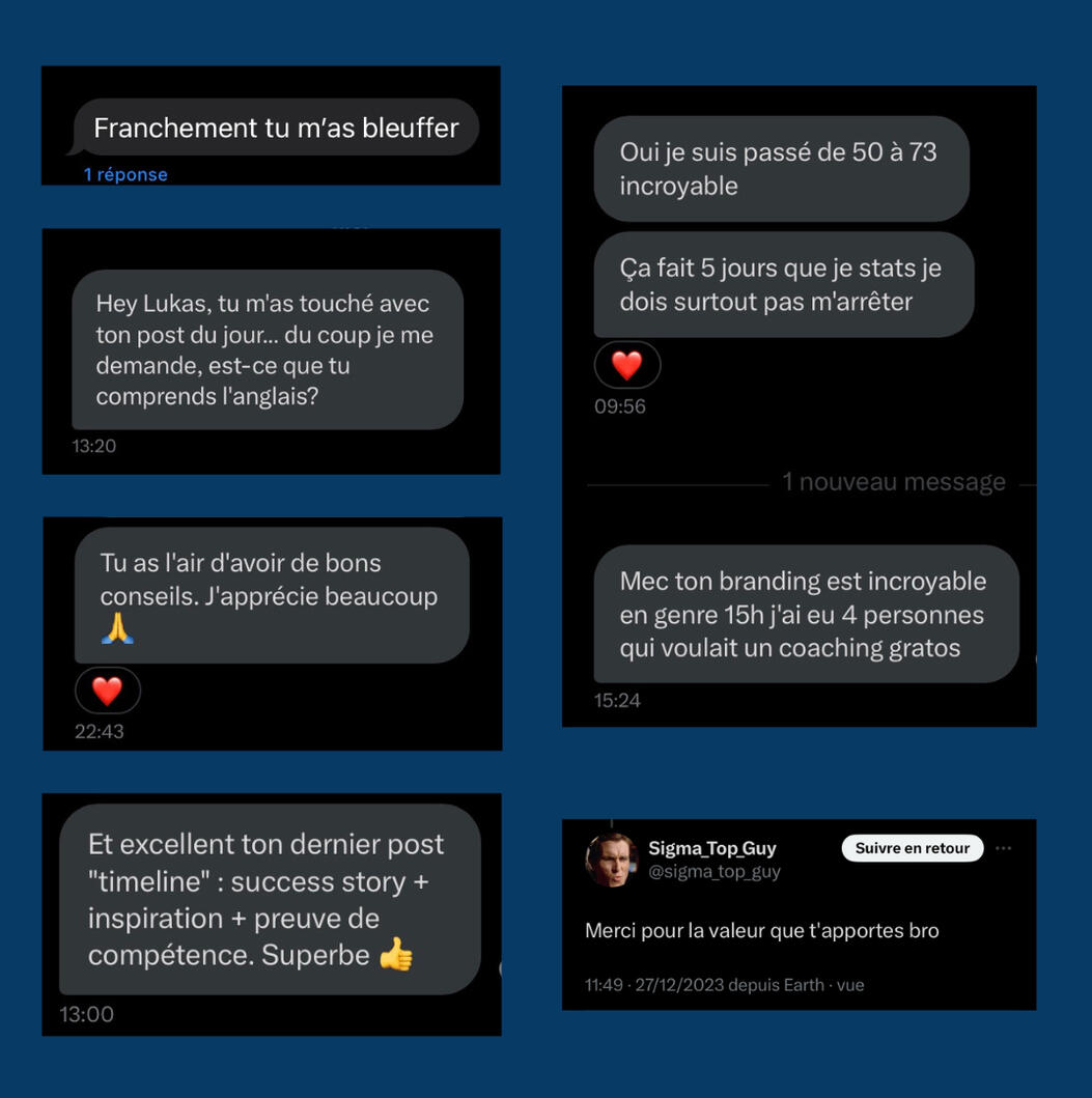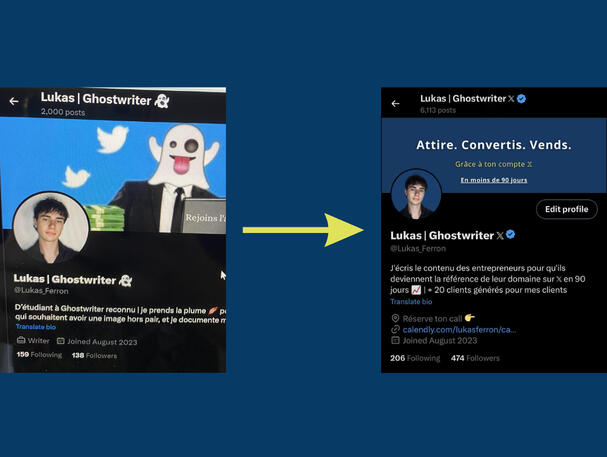 Je m’appelle Lukas Ferron, cela fait maintenant + de 6 mois que je crée le contenu des entrepreneurs sur LinkedIn et 𝕏.J’ai pu aider des dizaines d’entrepreneurs à développer leur compte grâce à mon expertise sur ces 2 réseaux.Et au niveau personnel, j’ai réuni une communauté de 1000 personnes au total en l’espace de 6 mois et en partant de 0.Aujourd’hui, j’aide les entrepreneurs à développer leur compte et à le monétiser.